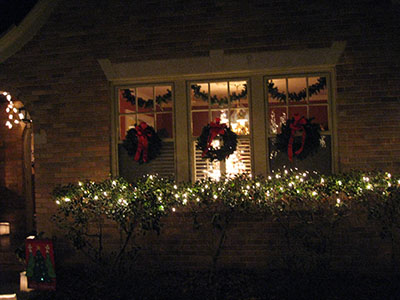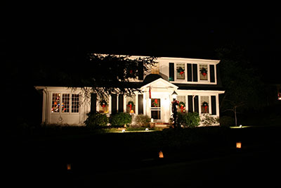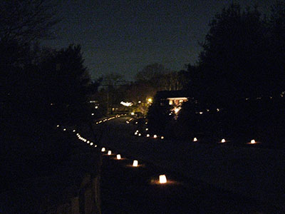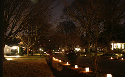 Ridgeside's traditional luminaries are usually placed along the streets the Monday and Tuesday before Christmas. Residents place white paper bags containing candles approximately 15 feet apart, down both sides of the streets. The candles are lit at twilight, about 6:00 and burn until 9:00. Sand for anchoring the candles is provided by the Community Club. The sand keeps the candles in place and prevents the sacks from blowing over. Sand is usually placed at the pool parking area for residents to pick up. Inventive folks use bricks with holes as candleholders. All Ridgeside residents cooperate in carrying on the long tradition. In case of rain or snow on the day of the lighting, the event is canceled. On nights of lighting, no cars are parked on the streets, and a neighborhood open house is held on the Monday night of the annual luminaries.