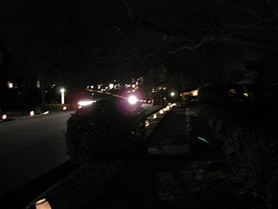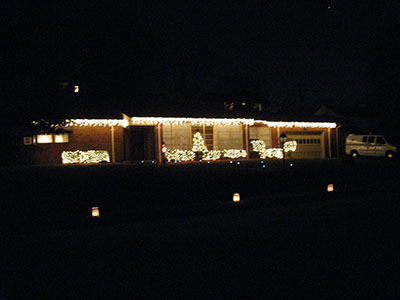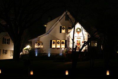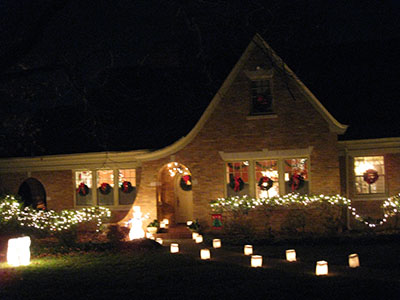 Ridgeside's traditional luminaries are usually placed along the streets the Monday and Tuesday before Christmas. Residents place white paper bags containing candles approximately 15 feet apart, down both sides of the streets. The candles are lit at twilight, about 6:00 and burn until 9:00. Sand for anchoring the candles is provided by the Community Club. The sand keeps the candles in place and prevents the sacks from blowing over. Sand is usually placed at the pool parking area for residents to pick up. Inventive folks use bricks with holes as candleholders. All Ridgeside residents cooperate in carrying on the long tradition. In case of rain or snow on the day of the lighting, the event is canceled. On nights of lighting, no cars are parked on the streets, and a neighborhood open house is held on the Monday night of the annual luminaries.